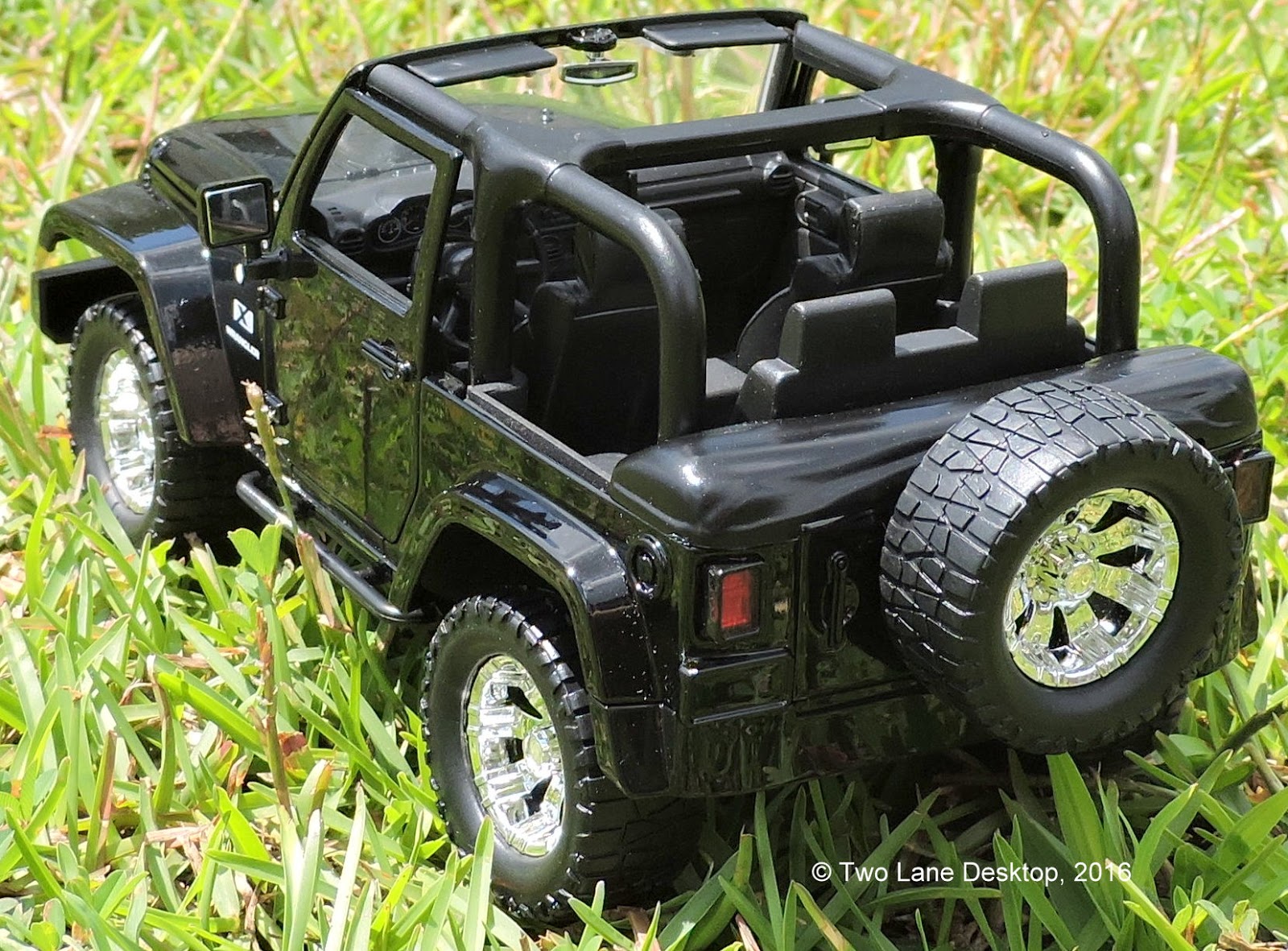 The hood opens to reveal the mostly all-black and engine pan of the 3.8 V6 motor, but it does have the detailed intake, valve covers, oil cap, battery, brake master cylinder, and fuse box. The base underneath shows off the proper drivetrain layout with a chrome rear muffler and rear axles that lack the pumpkin details. Open the doors to the all-black interior to a flat-faced dashboard with 4-spoke banjo steering wheel, detailed gauges, and a center stack with radio and HVAC controls. The 6-speed manual shifter is a bit small, but otherwise both shifters are nicely done. The seats are good if they lack support and there's enough room in the rear. At the time this was a simply-done Jeep that was the only large-scale, or heck the only modern Jeep Wrangler in the crowd, but as times change more and more Jeep Wranglers start to appear.