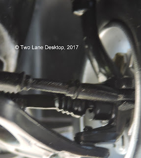 Under the hood is where things differ as this Ranger is powered by a 2.5L SOHC turbodiesel I-4 that produces 115 horsepower through a 5-speed manual transmission. The details are incredible underneath as you can see the dual batteries required for diesel vehicles, the detailed wiper motor on the firewall, fluid resovoir's, the brake master cylinder, the airbox that describes the diesel motor, timing belt cover, valve cover, drive belts, and radiator that is visible on both sides. Underneath is were some special time was taken to make this a top-notch design with the frame a separate piece of metal to allow the cab floor (in blue), the bed section, and even the engine and transmission to become visible and realistic. The front has skidplates in silver and black, detailed engine, transmission, and transfer case, exhaust system, drive shaft, fuel tank, rear axle with leaf springs, and full-size spare tire. Note that the screws that secure the bed and cab to the chassis are at the actual mounting points on the frame. The truck has working coil spring suspension, with the front having some very interesting articulation: the steering tie rods move with the steering rack and thus steer the wheels and while that is happening the CV joints for the front axle rotate in the steering knuckle. Very impressive!