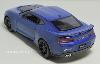 As mentioned in the Hot Wheels article on the new Camaro ZL1 the new ZL1 has more power and style, but after reviewing the Hot Wheels version I was less impressed with the casting. For those who feel the same way and have room for a slightly larger scale Camaro this Kinsmart is the way to go. Start off with some wild colors that range from the loud yellow and green to the cool blue and metallic red. Kinsmart is no stranger to the Camaro as they are so far the only diecast manufacturer to replicate the 2014 mid-cycle update Camaro that I profiled here along with the Maisto 1:43 scale version of the 2010 model. For 2017 Kinsmart tries out the new Camaro ZL1 and so far the details look impressive. The front-end looks much better detailed in this larger size to show off the honeycomb lower grille with ZL1 badge, side scoops with LED foglights, lower chin spoiler, center grille with blacked-out bowtie that also serves as an additional air scoop, and detailed headlights with projector beams and LED running lights. The hood bulge is a separate piece of plastic and looks much well-integrated over the Hot Wheels version that has the separate bulge as part of the metal body.
